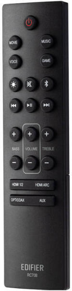 Távirányító Edifier B700-hoz Az Edifier B700 távirányítója sokoldalúan kezeli a soundbar összes funkcióját. Egyetlen kattintással válthat a hangmódok között, állíthatja a magas és mély hangokat, szabályozhatja a hangerőt és párosíthatja a Bluetooth-eszközöket. Emellett kiválaszthatja a forrásokat, megváltoztathatja a zeneszámokat, beállíthatja a kijelző fényerejét, és válthat a HDMI, AUX vagy optikai bemenetek között. Minden, amire szüksége van a hangzás maximalizálásához minden pillanatban! Gyártó EdifierSzín FeketeIlleszkedik Edifier B700Tápegység AAA elem
