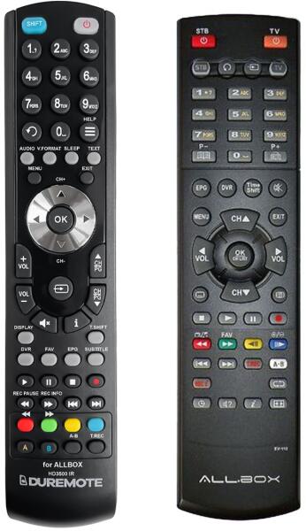 Az eredeti 1:1 arányú duplikátuma távirányító ALLBOX HD3500IR. Tökéletes 1:1 másolat, amelyet cégünk tervezett és gyártott – rendelkezik az összes funkcióval az eredeti távirányítóhoz ezeknél a ALLBOX márkájú modelleknél:HD 3500 IR, HD3500, HD3500IR. (Előfordulhat, hogy nem minden kompatibilis modell szerepel a listában. Ha nem biztos benne, csak adja meg a készülékmodelljét (online chat-en vagy e-mailben), és mi azonnal ellenőrizzük, if kompatibilis-e az Ön készülékével. Az ellenőrzött kompatibilitást mi garantáljuk. ) A távirányító General Duremote pontosan ugyanazokkal a funkciókkal és gombnevekkel rendelkezik mint az eredeti távirányító.  Nincs szükség beállításra és nincs szükség kódokra, csak helyezze bele az elemeket, és máris használható a fent felsorolt modellekkel. A távirányító ebben a regisztrált márkájú távirányító változatban kapható General Duremote(balra látható)Ez egy speciális helyettesítő távirányító (NEM egy általános "univerzális távirányító"). Pontosan ellátja az eredeti távirányító összes funkcióját. Ugyanazok a gombok nevei, mint az eredeti távirányítón. A gombok neveinek nyomtatása kopásálló. Normál használattal nem távolítható el. 36 hónap garanciávalGeneral Duremote távirányítót az eredeti távirányítónak megfelelően tervezték és készítették el gombról gombra. A távirányítót Csehországban tervezték, gyártották és tesztelték. Minden General-Duplicate távvezérlő megfelel a CE és a ROHS szabványoknak. EGYSZERŰ ÉS INTUITÍV HASZNÁLAT: Más általános/univerzális helyettesítő távirányítókkal ellentétben a General Duremote távirányító gombjai 100%-ban helyesen vannak felcímkézve. Összehasonlításként: más általános/univerzális helyettesítők standard nevekkel/leírásokkal és gombkiosztással rendelkeznek a költségek csökkentése érdekében, ami azt eredményezi, hogy a gombcímkék gyakran nem felelnek meg a gomb funkciójának, és ezért útmutatókra van szükség hozzájuk. Ez zavar. .