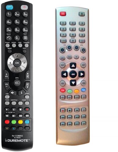 Az eredeti 1:1 arányú duplikátuma távirányító COMAG SL-100HD (SL100HD). Tökéletes 1:1 másolat, amelyet cégünk tervezett és gyártott – rendelkezik az összes funkcióval az eredeti távirányítóhoz ezeknél a COMAG márkájú modelleknél:SL-100HD, SL-200HD, SL100HD. (Előfordulhat, hogy nem minden kompatibilis modell szerepel a listában. Ha nem biztos benne, csak adja meg a készülékmodelljét (online chat-en vagy e-mailben), és mi azonnal ellenőrizzük, if kompatibilis-e az Ön készülékével. Az ellenőrzött kompatibilitást mi garantáljuk. ) A távirányító General Duremote pontosan ugyanazokkal a funkciókkal és gombnevekkel rendelkezik mint az eredeti távirányító.  Nincs szükség beállításra és nincs szükség kódokra, csak helyezze bele az elemeket, és máris használható a fent felsorolt modellekkel. A távirányító ebben a regisztrált márkájú távirányító változatban kapható General Duremote(balra látható)Ez egy speciális helyettesítő távirányító (NEM egy általános "univerzális távirányító"). Pontosan ellátja az eredeti távirányító összes funkcióját. Ugyanazok a gombok nevei, mint az eredeti távirányítón. A gombok neveinek nyomtatása kopásálló. Normál használattal nem távolítható el. 36 hónap garanciávalGeneral Duremote távirányítót az eredeti távirányítónak megfelelően tervezték és készítették el gombról gombra. A távirányítót Csehországban tervezték, gyártották és tesztelték. Minden General-Duplicate távvezérlő megfelel a CE és a ROHS szabványoknak. EGYSZERŰ ÉS INTUITÍV HASZNÁLAT: Más általános/univerzális helyettesítő távirányítókkal ellentétben a General Duremote távirányító gombjai 100%-ban helyesen vannak felcímkézve. Összehasonlításként: más általános/univerzális helyettesítők standard nevekkel/leírásokkal és gombkiosztással rendelkeznek a költségek csökkentése érdekében, ami azt eredményezi, hogy a gombcímkék gyakran nem felelnek meg a gomb funkciójának, és ezért útmutatókra van szükség hozzájuk. E. .
