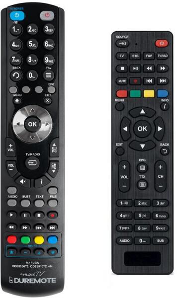 Az eredeti 1:1 arányú duplikátuma távirányító FUBA ODE8500T2, ODE8510T2 HEVC. Tökéletes 1:1 másolat, amelyet cégünk tervezett és gyártott – rendelkezik az összes funkcióval az eredeti távirányítóhoz ezeknél a FUBA márkájú modelleknél:ODE8500 STEALTH, ODE8500T2, ODE8500T2 HEVC, ODE8510, ODE8510 T2 STEALTH, ODE8510T2, ODE8510T2 HEVC. (Előfordulhat, hogy nem minden kompatibilis modell szerepel a listában. Ha nem biztos benne, csak adja meg a készülékmodelljét (online chat-en vagy e-mailben), és mi azonnal ellenőrizzük, if kompatibilis-e az Ön készülékével. Az ellenőrzött kompatibilitást mi garantáljuk. ) A távirányító General Duremote pontosan ugyanazokkal a funkciókkal és gombnevekkel rendelkezik mint az eredeti távirányító.  Nincs szükség beállításra és nincs szükség kódokra, csak helyezze bele az elemeket, és máris használható a fent felsorolt modellekkel. A távirányító ebben a regisztrált márkájú távirányító változatban kapható General Duremote(balra látható)Duplikált távirányító 2 az 1-ben: Ez a távirányító rendelkezik tanulógombokkal, amelyeket az eredeti távirányítón (a MINI-TV részben) található funkciók tanulására/másolására használhat. Ez azt jelenti, hogy két készüléket is működtethet egyetlen távirányítóval (pl. a DVD és a TV alapfunkcióit). A tanulógombok használatára vonatkozó utasításokat a távirányítóval együtt mellékeljük. Ez egy speciális helyettesítő távirányító (NEM egy általános "univerzális távirányító"). Pontosan ellátja az eredeti távirányító összes funkcióját. Ugyanazok a gombok nevei, mint az eredeti távirányítón. A gombok neveinek nyomtatása kopásálló. Normál használattal nem távolítható el. 36 hónap garanciávalGeneral Duremote távirányítót az eredeti távirányítónak megfelelően tervezték és készítették el gombról gombra. A távirányítót Csehországban tervezték, gyártották és tesztelték. Minden General-Duplicate távvezérlő megfelel a CE és a ROHS szabványoknak. EGYSZERŰ . .